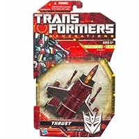 THRUST was great to have around during the early days of the war, when the DECEPTICONS won victory after victory. His thundering engines and shouted threats terrified the few AUTOBOTS that stood against them. It wasnt until later, when the AUTOBOTS got organized enough to put up a real fight, that THRUST began screaming like an alpha unit and fleeing at the first sign of danger. Race into action with this fearsome THRUST figure! In robot mode with his twin cannons and two firing missile accessories, this fighter is as tough as they come.